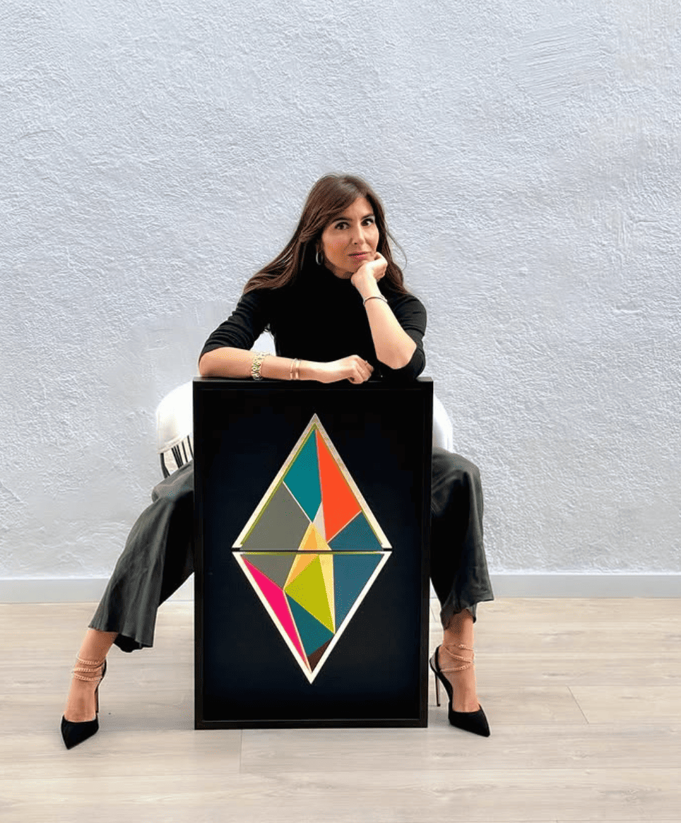 Anita Suárez de Lezo is an artist and designer. After working in the fashion industry and completing a master’s degree in graphic design, she developed a distinctive artistic language influenced by architecture and Eastern minimalism. Positioned between painting and sculpture, her work is defined by geometric compositions, vibrant colors, and a strong sense of movement. Through the use of singular materials such as mirrors and 24K gold, her pieces convey vitality and optimism, creating emotion through the simplicity of form.