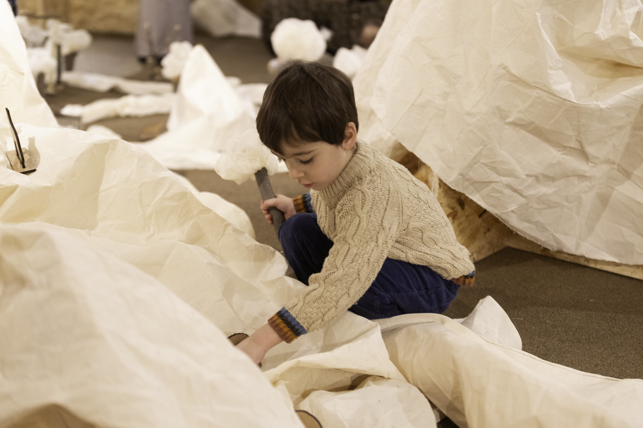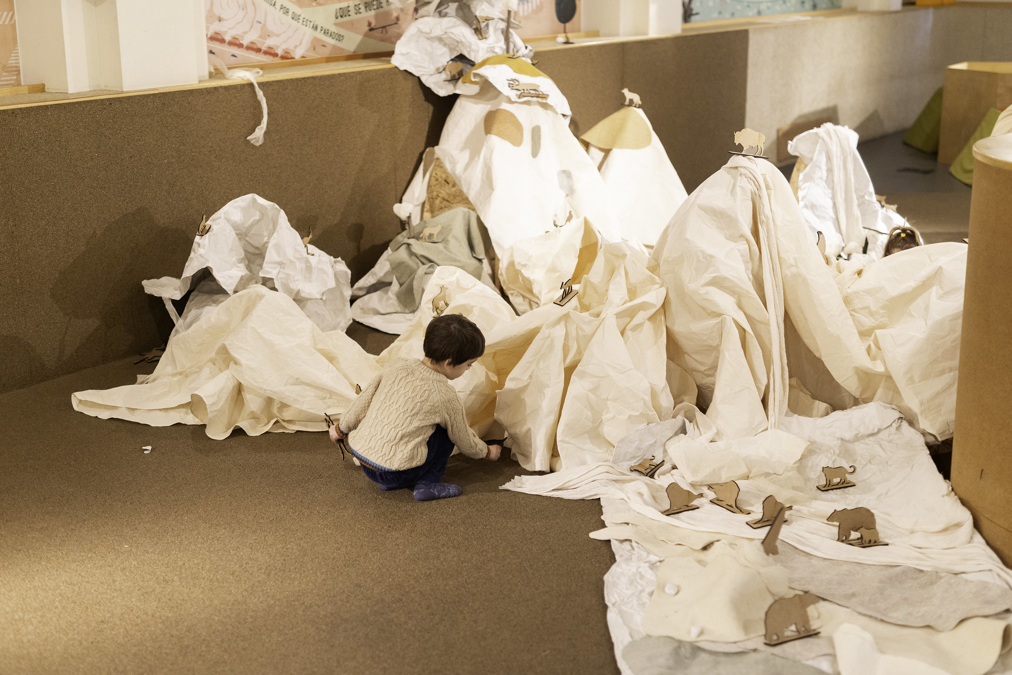 La instalación propone un espacio abierto de creación en el que el vacío inicial sirve como punto de partida para la construcción de un paisaje. A partir de una selección de materiales, los participantes desarrollan conjuntamente un sistema montañoso con ríos, lagos, praderas y habitantes no humanos.