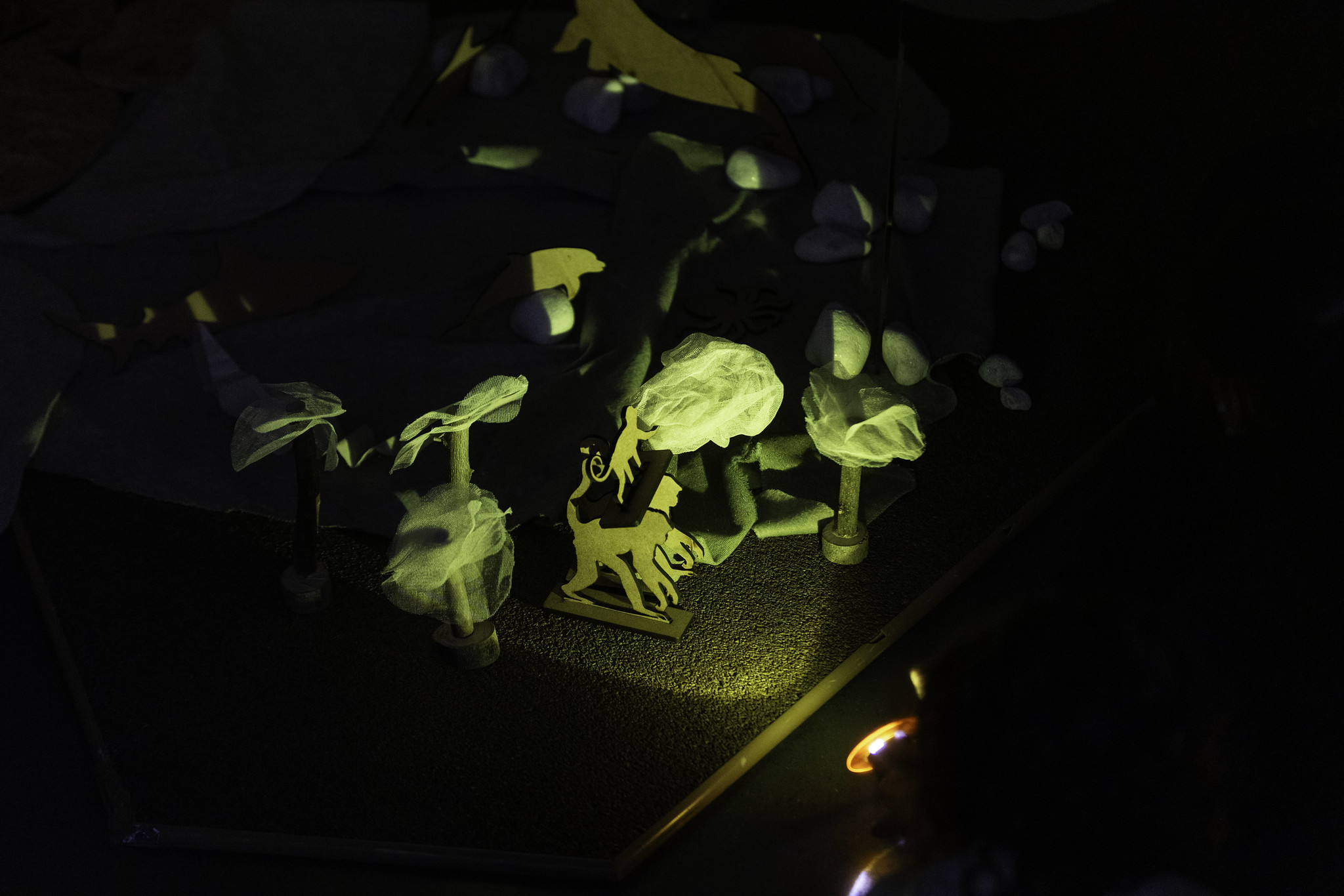 The work focuses on the configuration of a natural environment through the arrangement of reliefs, water, vegetation, fauna, and light. The resulting landscape functions as a stage for creating visual narratives, using shadows and the spatial relationships between elements.