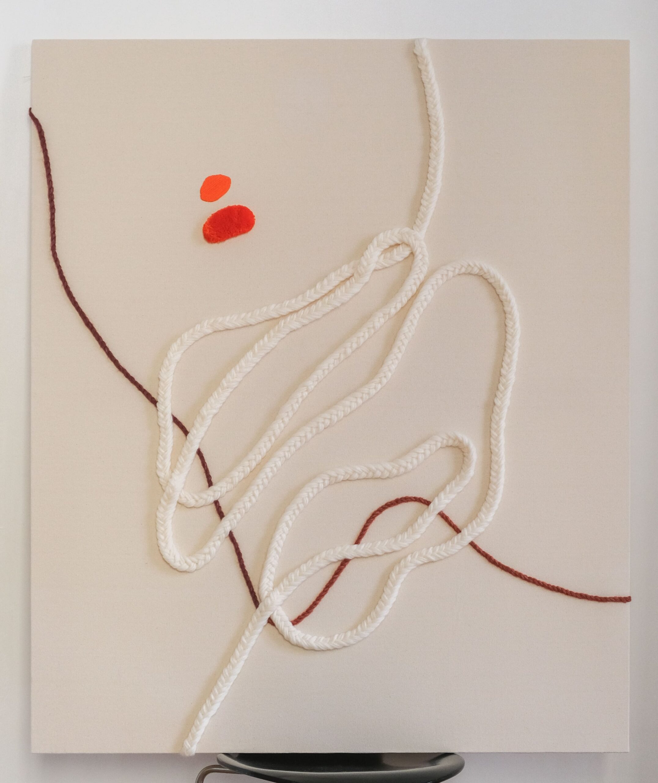 Esta obra forma parte de la colección Movimientos y nace de la idea de la vida como un flujo constante, donde nada permanece fijo. Los trazos iniciales, traducidos al lenguaje textil, se transforman en recorridos de hilo, textura y volumen que avanzan, retroceden y se cruzan, como lo hacen las decisiones y los caminos vitales. La composición no busca representar una imagen cerrada, sino generar un espacio abierto que invita al espectador a recorrerla con la mirada, a detenerse en sus densidades y vacíos, y a experimentar el movimiento como una forma de construcción de identidad.