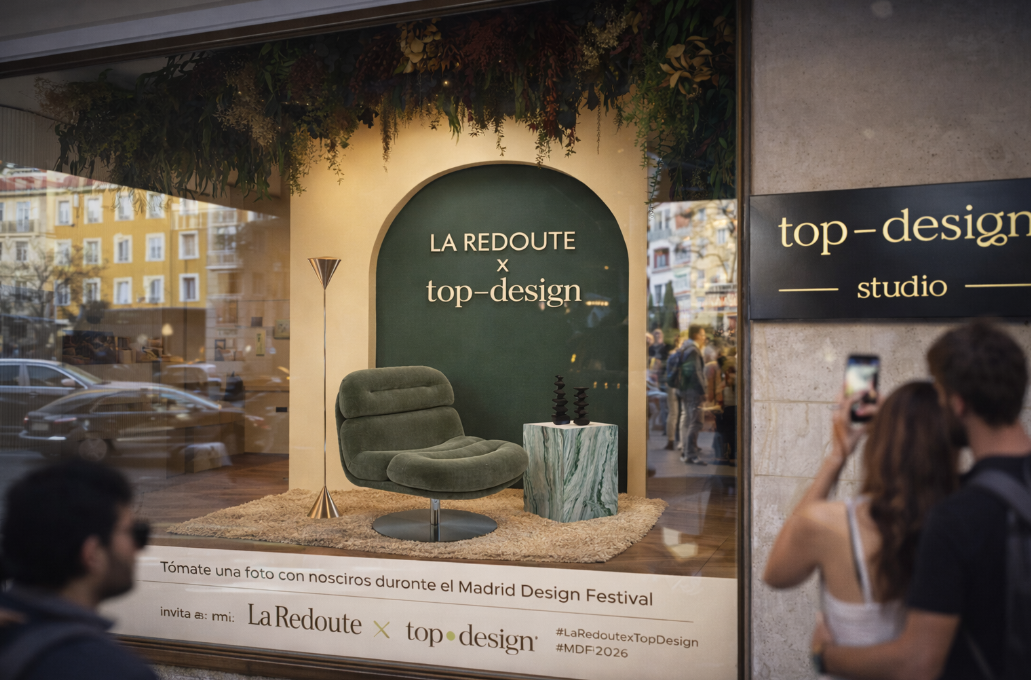 Durante el Madrid Design Festival, el escaparate de Top Design se transforma en un escenario abierto a la ciudad gracias a una intervención creada en colaboración con La Redoute. Este corner nace como un espacio pensado para ser observado, vivido y fotografiado desde el exterior, diluyendo los límites entre interiorismo, arquitectura efímera y experiencia urbana.